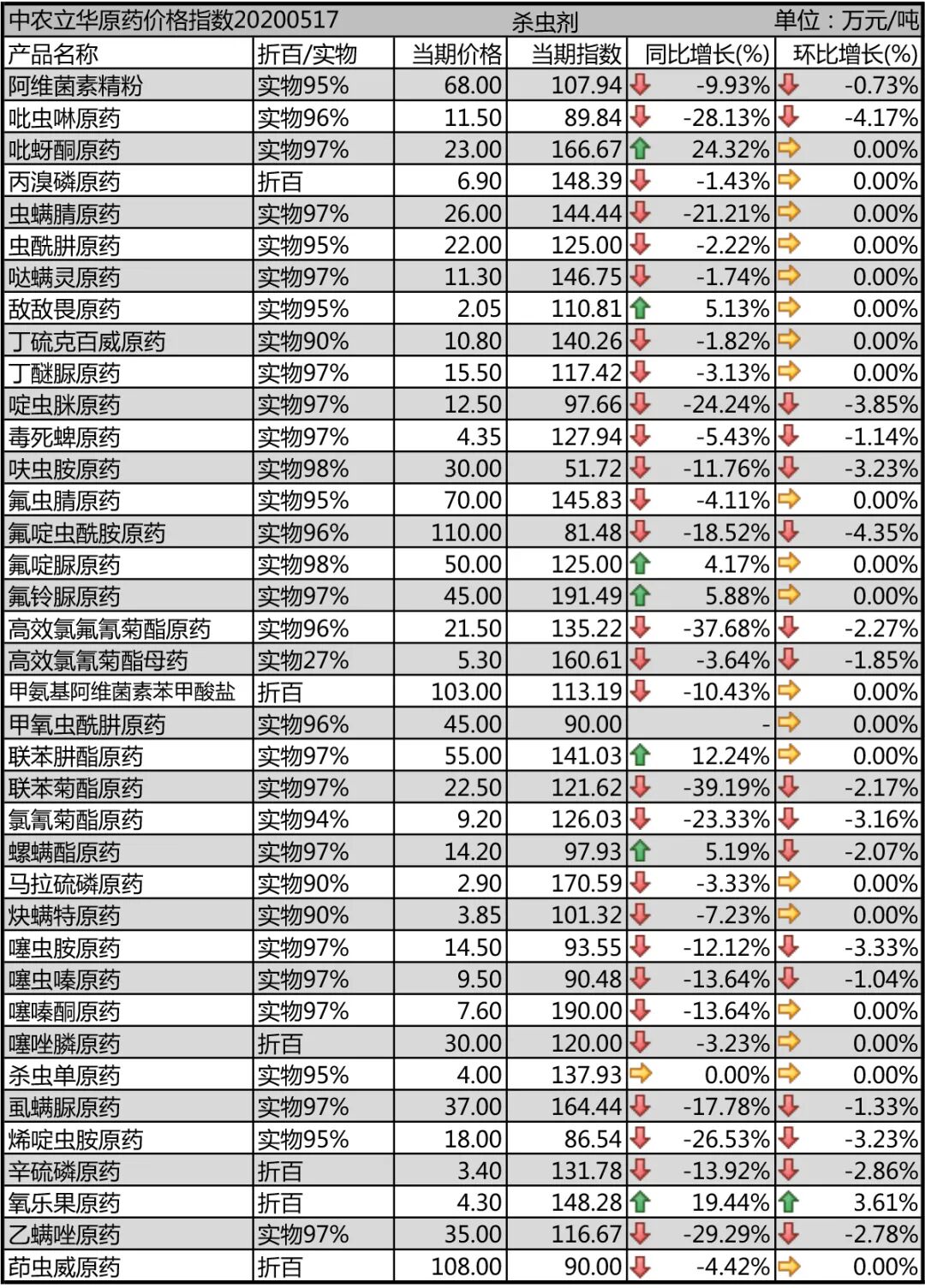 2020年05月17日中农立华杀虫剂原药价格指数报106.63点,同比去年大幅下跌21%,受大产品下跌影响,环比上月继续下跌2.9%,菊酯类产品受印度方面的影响,冲高后有所回落,氯氰菊酯原药(-12.4%)、毒死蜱原药(-5.4%)、虱螨脲原药(-5.1%)等跌幅居前。
