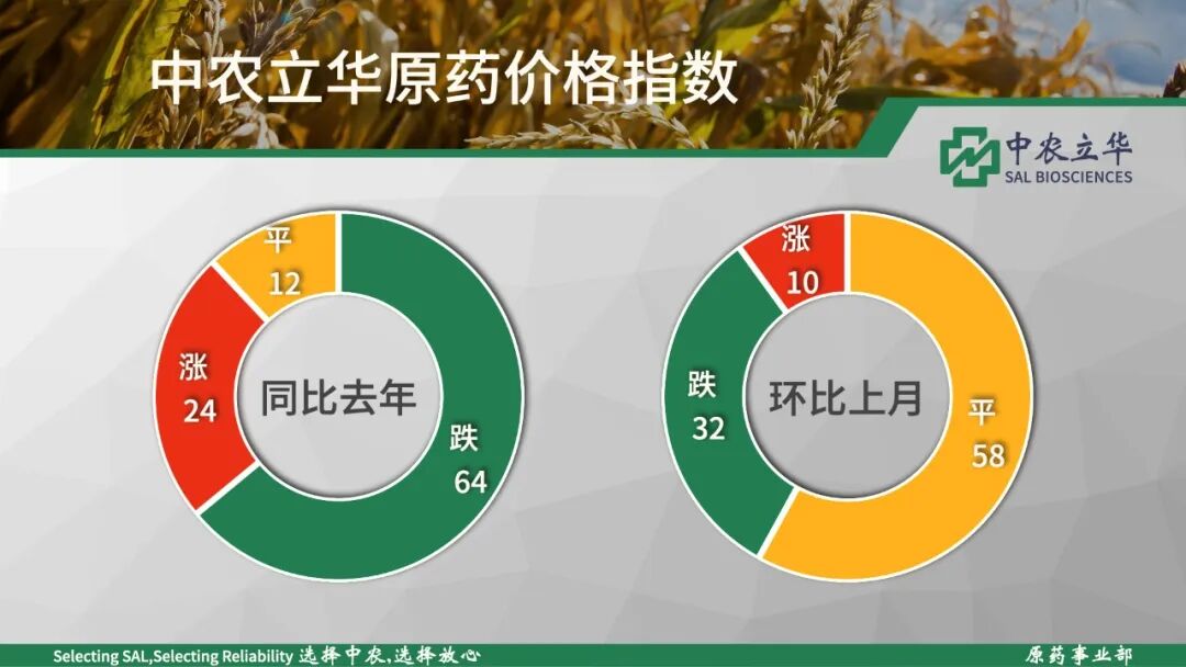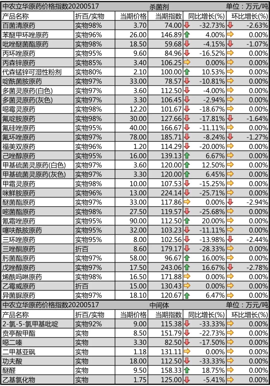 2020年05月17日,中农立华原药价格指数报101.04点,同比去年下跌13.8%,环比上月下跌0.99%,三大品种除了除草剂原药受草甘膦原药回升的带动上涨外,杀虫剂原药和杀菌剂原药均出现较大幅度回调。同比去年下跌及环比上月下跌品种,均有所增加,原药稳中下行。