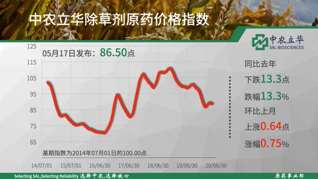 2020年05月17日中农立华除草剂原药价格指数报86.50点,同比去年下跌13%,环比上月微涨,主要是由于草甘膦原药上涨的带动,烯禾啶母药(+10.0%)涨幅较大;烯草酮原药(-6.7%)、炔草酯原药(-6.4%)等跌幅居前。