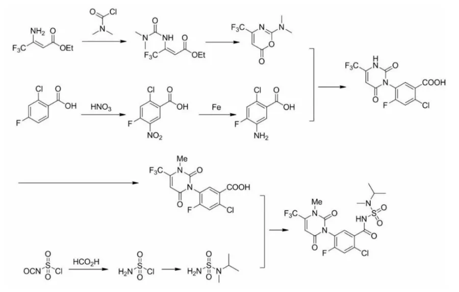 苯嘧磺草胺是由巴斯夫开发的嘧啶类原卟啉原氧化酶(PPO)抑制剂。可作为灭生性除草剂用,可有效防除多种阔叶杂草,具有作用快、残效期长等多种特性。