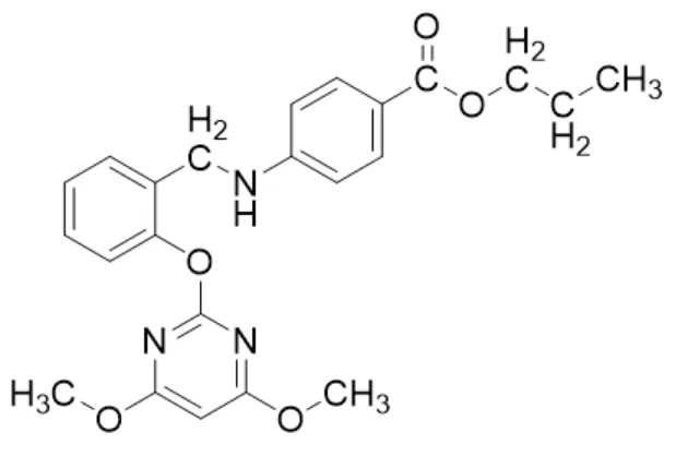 丙酯草醚是由浙江省化工研究院和中科院上海有机所共同创制的一种属于嘧啶类的新型除草剂,以根、芽、茎、叶吸收并在植物体内传导为主要作用方式,能有效防治一年生禾本科杂草和部分阔叶杂草,如:看麦娘、日本看麦娘、繁缕、牛繁缕、雀舌草等。是一种常见的油菜田除草剂。目前国内的登记剂型为10%丙酯草醚、10%异丙酯草醚悬乳剂。
