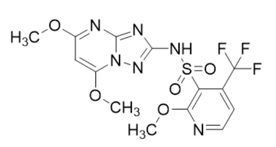 啶磺草胺分子式:C14H13F3N6O5S,相对分子质量:434.06,结构如图5。外观为棕褐色粉末,原药质量分数≥96.5%;熔点:208.3℃,分解温度:213℃;蒸气压:(20℃)时<1×10-7Pa,溶解度(g/L,20℃):纯净水中0.062 6,pH=7缓冲液中3.20,甲醇中1.01,丙酮中2.79,正辛醇中0.073,乙酸乙酯中2.17,二氯乙烷中3.94,二甲苯中0.035 2,庚烷中≤0.001。