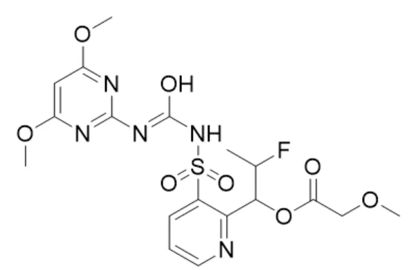 氟吡磺隆分子式:C18H22FN5O8S;相对分子质量:487.46;结构式如图4。密度:1.417 g/cm3;蒸气压:<1.86×10-5;熔点:178~182℃,在20℃时,酸度系数(pKa)为3.5。溶解度:25℃时在pH=7的水中的溶解度为0.114;20°C时有机溶剂中的溶解度(g/L)丙酮22.9;乙酸乙酯11.7;二氯甲烷113.0;二甲基甲酰胺265.0;二甲基亚砜211.7;正己烷0.006;甲醇3.8。