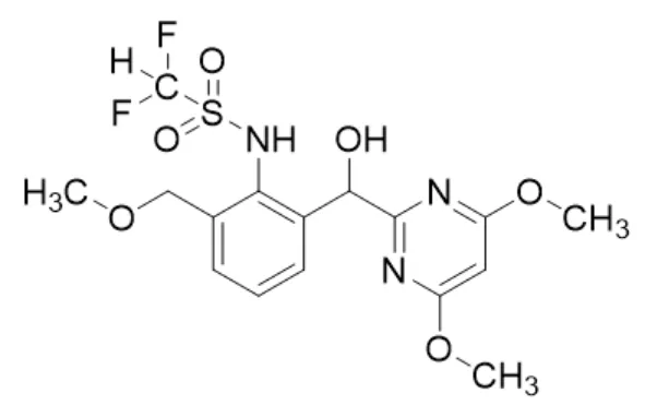 苯嘧磺草胺分子式:C17H17ClF4N4O5S,相对分子质量:500.05,结构如图7。制剂外观为浅褐色挤条颗粒状,自由状态下平均0.574 kg/L,挤压状态下0.628kg/L;分散剂木素硫化盐6%,分散剂烷化萘磺化盐4%,润湿剂烷基萘磺化盐1%,水1%,硫酸铵盐16.13%。54℃贮存21天稳定。pH=5.02。